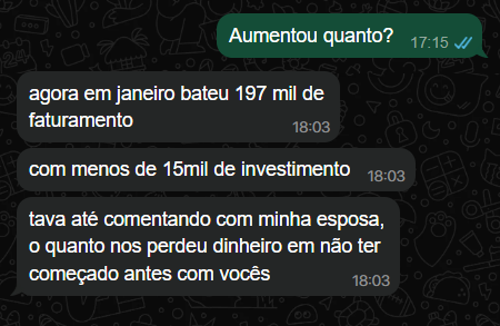 Garantimos que, se seguir o processo e aplicar os ajustes recomendados, sua empresa terá mais oportunidades reais de venda. Muitos dos nossos clientes aumentaram em até 30% o faturamento em 60 dias. O crescimento depende de dois fatores: nossa gestão de tráfego e sua execução interna no atendimento e fechamento.
